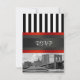 Customisable Invitations and accessories with an East River view of New York City's iconic Brooklyn Bridge and Municipal Building with a boat passing by. It also features a black and white stripe pattern, a red and black ribbon. Image is in black & white.