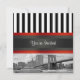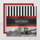 Customisable Invitations and accessories with an East River view of New York City's iconic Brooklyn Bridge and Municipal Building with a boat passing by. It also features a black and white stripe pattern, a red and black ribbon. Image is in black & white.