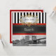 Customisable Invitations and accessories with an East River view of New York City's iconic Brooklyn Bridge and Municipal Building with a boat passing by. It also features a black and white stripe pattern, a red and black ribbon and a white gradient label with a gold look frame. Image is in black & white.