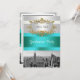 Customisable invitations and accessories with an iconic view of the New York City skyline from the top of 30 Rockefeller Centre, featuring a black & white photo of the ESB, into lower Manhattan including the World Trade Centre. They also feature a white gradient background, a teal ribbon and a white gradient label in a gold look frame.