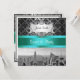 Customisable Invitations and accessories with an iconic view of the New York City skyline from the top of 30 Rockefeller Centre, featuring a black & white photo of the Empire State Building, lower Manhattan including the World Trade Centre. It also features a black damask pattern against a gradient silver grey background, and a turquoise ribbon. It also features a white gradient label in a silver look frame.