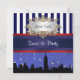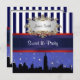 Customisable Invitations and accessories with an iconic silhouette view of the New York City featuring the Emp St Building, the Chrysler Building against a starry blue sky. They also feature a navy blue and white striped pattern, a red and blue ribbon and a white gradient label with your choice of a silver or gold look frame.