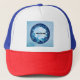new york skyline of skyscrapers in round small planet with text trucker cap.
