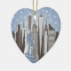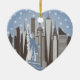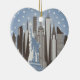 An art deco render of NYC's iconic skyline and Statue of Liberty in chocolate, silver, and winter blue against a backdrop of snowflakes.