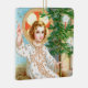 Detail of a charming, vintage image of the Christ Child personally delivering a candle-lit Christmas tree to a home that has prepared for His coming. Here, Jesus, seated upon His straw-filled manger, wears a white robe decorated with a gold cross and stars. At the centre of the cross on His chest is a quatrefoil containing the IHS, one of several Greek monograms for His name. He raises His right hand in blessing and holds the Christmas tree upright in His left. Perfect for Advent! + Image Credit: Detail of “Gloria in excelsis Deo,” devotional print in gilt chromolithography, late 19th-early 20th century, original publisher (perhaps German) unknown, from the designer’s private collection of religious ephemera. + Image Credit (Back): Gold stars on red background by rebeccaread via Pixabay.