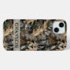 Customise this oak tree camouflage iPhone 15 plus case with your name in a trendy modern CAP font in grey on opaque cream. It's masculine and perfect for your favourite military, hunting, country or outdoorsman!