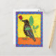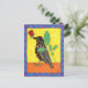 This beautiful crow is covered with multicolored markings in many different shapes reminscent of those found on painted Oaxacan animal carvings. She stands on a vibrant orange surface against a vivid yellow background, holding a red rose in her beak. The entire scene is surrounded by a detailed Mexican-style border.