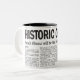 Mug with newspaper spread commemorating Barack Obama's historic election as the first African American president in US history.