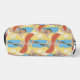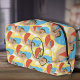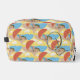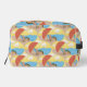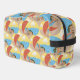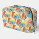 Beach chair and umbrella artwork pattern toiletry bag with single initial template for personalising. Gift to bridesmaids, or anyone who loves the beach. Warm, earthy colours on this makeup bag with a repeating pattern and summer vibe that reminds one of a summer day by the sea. Colours are blue, beige, yellow and off-white and cover all areas of this bag with a zipper. Size is 9x8x4 - see description for more info. The pattern will transfer to other bag styles, but the initial template may be off and need to be removed.
