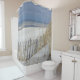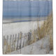 Pretty beach scene with sand dune and beach fence looking towards a sandy beach and the Atlantic ocean. Photo taken at Mayflower Beach on Cape Cod in late autumn.