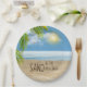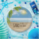 Tropical palm fronds on beach with seagull, cloud and sunshine.