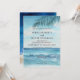 This customisable wedding invitation card features minimalist typography on an ocean blue beach and waves background with a single palm leaf outline across the upper part of the card. For more advanced customisation of this design, e.g. changing layout, font or text size please click the "CUSTOMIZE" button above.