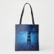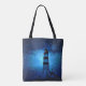 Ocean lighthouse a dark blue night with drops tote bag