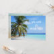 Welcome to class, message from teacher cards. Personalise with text on front and back. The image is tropical blue ocean water and a palm tree. Sample text is, “Welcome to Any grade”. On the back, create a message to the student over a beach sand image.