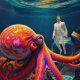 "Ocean’s Silent Captive" – Colourful Octopus Portrait. In a surreal ocean world, a giant octopus watches a lone man trapped inside a glass jar. This evocative scene explores themes of confinement, the vastness of nature, and the fragile barrier between freedom and captivity. The vibrant colours and intricate details invite deep reflection on human vulnerability beneath the waves.