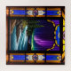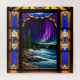 Artistic stained glass window showcasing a vibrant aurora over an ocean bay landscape surrounded by nature.