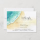 This beautiful Beach RSVP card features watercolor waves along the sandy beach. The words "Kindly reply" are in a hand lettered calligraphy style font. All the response card details are in black and include meal choice preferences. The back of the card has an aqua background with the bride and groom's names and wedding date in white. This design coordinates with the other products in the Cabo San Lucas • El Arco Wedding collection.