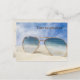 Starfish reflection and ocean water mirrored in aviator sunglasses on beach sand.