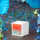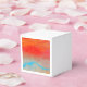 An abstract design of an ocean sunset with bold colours in red, orange, cyan, blue, and beige.