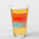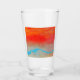 An abstract design of an ocean sunset with bold colours in red, orange, cyan, blue, and beige.