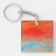 An abstract design of an ocean sunset with bold colours in red, orange, cyan, blue, and beige.