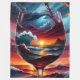 Dive into a surreal seascape with this imaginative artwork featuring an ocean sunset captured within a wine glass. The dynamic scene showcases large waves curling and crashing under a vibrant sunset sky, with rich hues of blue, burgundy, red, orange, and white creating a dramatic contrast. Adding to the drama, a storm brews in the background with lightning illuminating the dark clouds. In a whimsical twist, wine is being poured from a cloud in the sky into the glass below. The reflection of the sky in the water adds depth and a dreamlike quality to the piece. This unique design blends elegance with the wild beauty of nature, making it a captivating addition to any decor.
