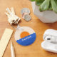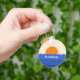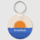 Beautiful elegant key chain with minimalistic scene of ocean and setting sun. Personalise it with a name or text. This simple illustration captures the serene beauty of a sun setting at the ocean. The waves are simple curved lines, starting from the bottom of the illustration and extending upwards towards the horizon line. Different shades of rich blue add to the sea dynamics. The sun is a large circle glowing in a brilliant orange, dipping into ocean. The sun and the ocean waves evoke vintage vibes and create tranquil scene and elegant design.