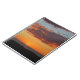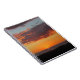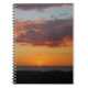 This notebook features a photo of the sun setting over the Pacific Ocean. The sunset lights up the sky and underside of the clouds in bright orange with a stripe of gray blue still visible between the clouds. The foreground captures the dunes in shadow as the sun sinks lower on the horizon.