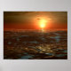 3d rendering of a red sunset over the ocean, with waves and blue tinted foam. High contrast composition, with two dominant complementary colours, blue and orange.