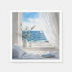 An open window showcases a breathtaking ocean view with a sailboat on the waves, while a cozy bed, a book, a white coffee mug, and a vase of eucalyptus enhance the room's charm