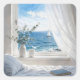An open window showcases a breathtaking ocean view with a sailboat on the waves, while a cozy bed, a book, a white coffee mug, and a vase of eucalyptus enhance the room's charm