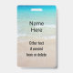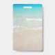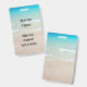 Ocean water and beach scene custom badge with two places for text. Include a name and more text beneath, or go into the customise area and change whatever you need to. Reverse has the same image without text.