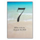 Pretty blue ocean water and sandy beach table number cards. Vertical cards with big black number which will show on both sides. Add the names of the bride and groom and wedding date also.