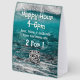 Oceanside restaurant paper table tent sign. Blue ocean water background and white text with a QR code template. Printing is the same on both sides, but the background, crashing wave is a little different. Sample wording is for happy hour, with a place for time / hours, special offer and menu QR code. Perfect for any bar / establishment on, or near, the water. Comes in two sizes.