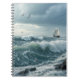 Ocean waves with seagulls flying overhead and a ship in the distance