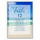 Help guests find their seat with these elegant beach photo table number cards with names. A beautiful ocean waves photo decorates this modern destination wedding table card. The number is written in pretty blue over the tropical seaside photograph.