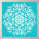 This white mandala sits on a turquoise background. The colours are very calming and peaceful. Part of the Pras Mandala Collection.