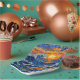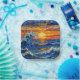 A paper plate with an illustration of a stained glass mosaic ocean waves and sunset illustration. These are perfect for a beach themed coastal birthday party.
