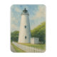 This serene watercolor captures the timeless beauty of the Ocracoke Lighthouse, North Carolina's oldest operating lighthouse. Its gleaming white taper stands gracefully against a soft, sun-dappled sky, radiating a sense of peaceful enduring strength. A classic white picket fence guides the eye along a weathered boardwalk, leading to the lighthouse and its small, accompanying white structure. Lush green trees provide a verdant backdrop, enhancing the tranquil atmosphere. This piece beautifully evokes the quiet charm and historic allure of Ocracoke Island, a true coastal treasure.