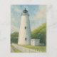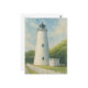 This serene watercolor captures the timeless beauty of the Ocracoke Lighthouse, North Carolina's oldest operating lighthouse. Its gleaming white taper stands gracefully against a soft, sun-dappled sky, radiating a sense of peaceful enduring strength. A classic white picket fence guides the eye along a weathered boardwalk, leading to the lighthouse and its small, accompanying white structure. Lush green trees provide a verdant backdrop, enhancing the tranquil atmosphere. This piece beautifully evokes the quiet charm and historic allure of Ocracoke Island, a true coastal treasure.