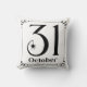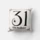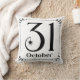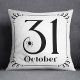 Celebrate Halloween in style with this "31 October" throw pillow featuring simple decorative black lettering, a spooky spider accent, along with a scroll and star border on a white background.