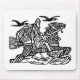 Odin rides his eight-legged horse Sleipnir through the waves, with his ravens Huginn and Muninn flying overhead. Sleipnir's legs represent the directions on a compass or the eight spoked wheel of the year, which allowed him to carry Odin between worlds.