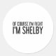 Of Course I'm Right I'm Shelby Name Funny Christma Classic Round Sticker