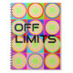 Notebook with colourful circles and "OFF LIMITS" on the front