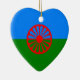 Official Romany gypsy traveller flag of green and blue representing the earth and sky with a red wagon wheel, representing travel.