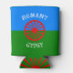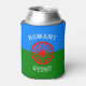 The official Romany gypsy travelers flag of the Roma gipsies with a green and blue background representing the sky and earth with a bright red mandala wagon wheel representing travel, and personalised text templates easily change the text or add your name to create to your own custom flag design.