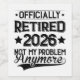 The "Retired 2026 Not My Problem Anymore Retirement" brings a humorous twist to celebrating retirement for men and women. This playful design marks the milestone of stepping into a new, relaxed chapter of life with a touch of fun. Perfect for those retiring in 2026, this design lets you embrace retirement with a smile and a sense of humor.
