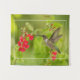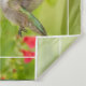 A sweet hummingbird hovers before bright red salvia blossoms against a soft green background.