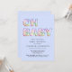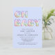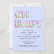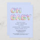 This cute blue minimal modern baby boy shower invitation features "OH BABY" composed of balloon illustrations in a rainbow of paste, blue, green, pink, purple and orange.