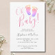 These Couples Girl's Baby Shower Invitations are decorated with stylish pink typography and cute watercolor baby's feet in pastel rainbow colours.